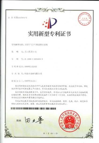 ![]() 壓縮空氣空壓機(jī)房供應(yīng)系統(tǒng)專利證書 |