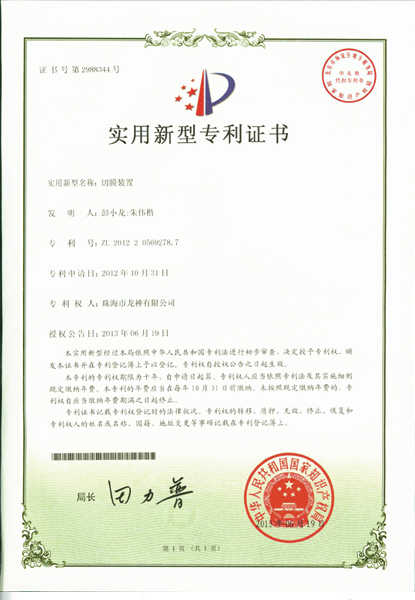 一種自動(dòng)測(cè)量切膜架專利證書 |