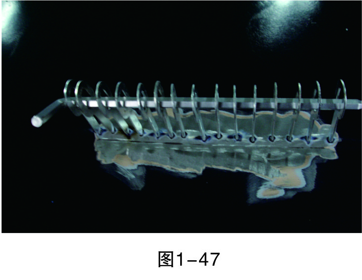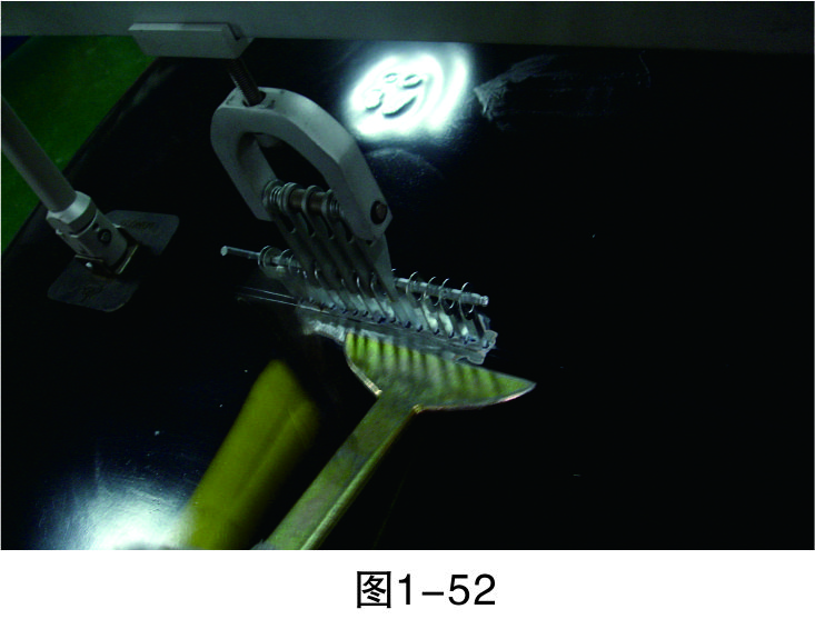 步驟6(穿進(jìn)L形鐵):在介子中穿入L形鐵,以便整形架的拉鉤能固定在上面進(jìn)行拉伸作業(yè),如圖1-47所示。