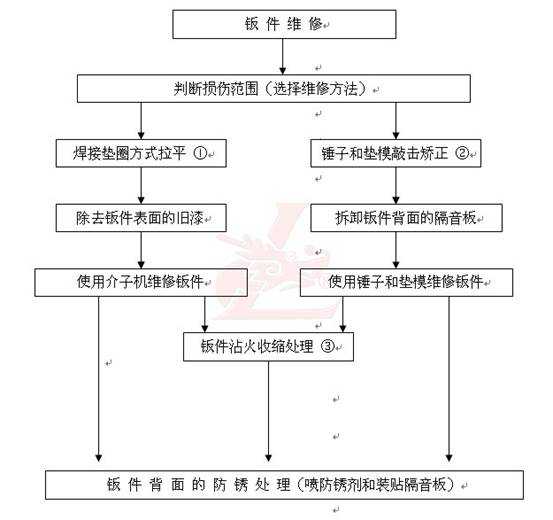 (4)鈑金件拉平。根據(jù)鈑金件損傷程度,采用相應(yīng)的鈑金工具將凹陷部位拉平。拉平作業(yè)后,鈑金件表面要經(jīng)過平整度精調(diào)。