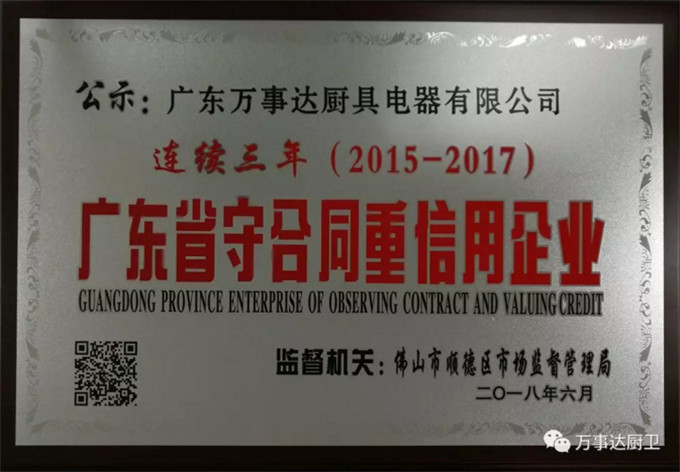 誠實守信,是立人之本,也是企業(yè)發(fā)展之根基。日前,廣東省工商行政管理局、佛山市工商行政管理局批復授權廣東省不銹鋼材料與制品協(xié)會開展“守合同重信用”公示活動,53家企業(yè)獲得公示,其中,廣東萬事達廚具電器有限公司榜上有名,彰顯誠信本色。