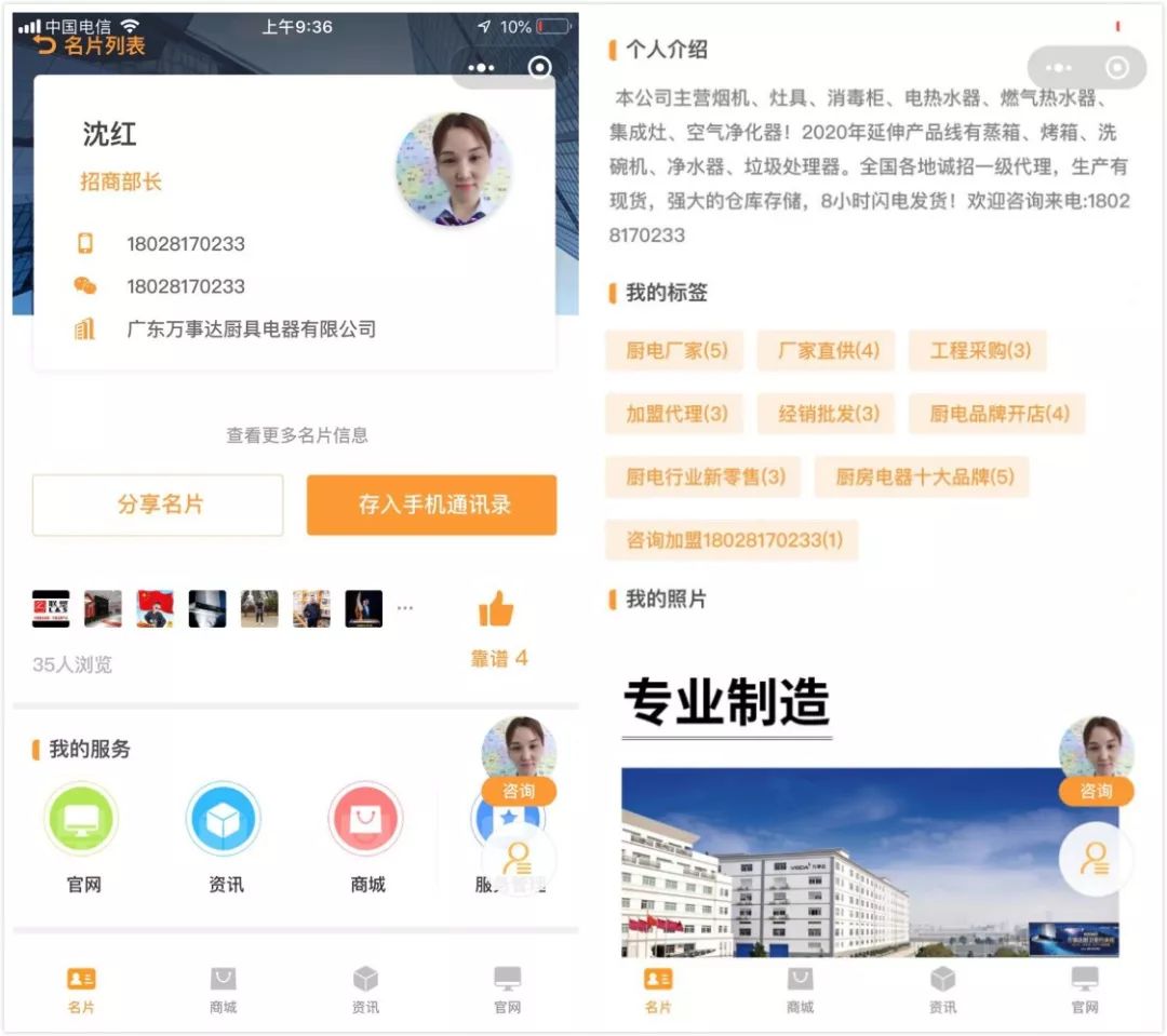 1、代理商將獲得自己公司/(自己門店)的獨立傳播平臺,在新零售平臺的“名片編輯”,可以介紹公司情況和個人信息,方便客戶查看和了解;
