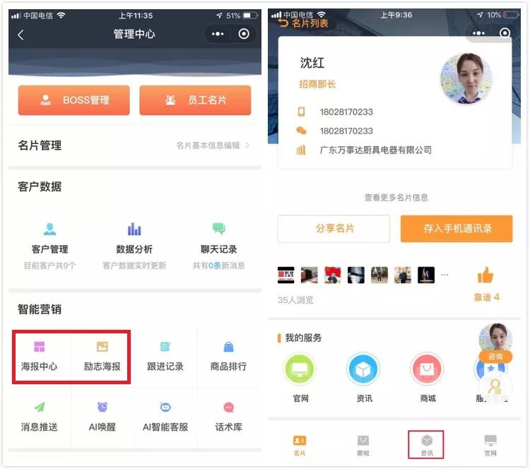 客戶管理,能讓您了解所有點擊過您發(fā)出的海報或者資訊鏈接的意向客戶情況,在不加微信的情況下可以發(fā)信息和打電話溝通;
