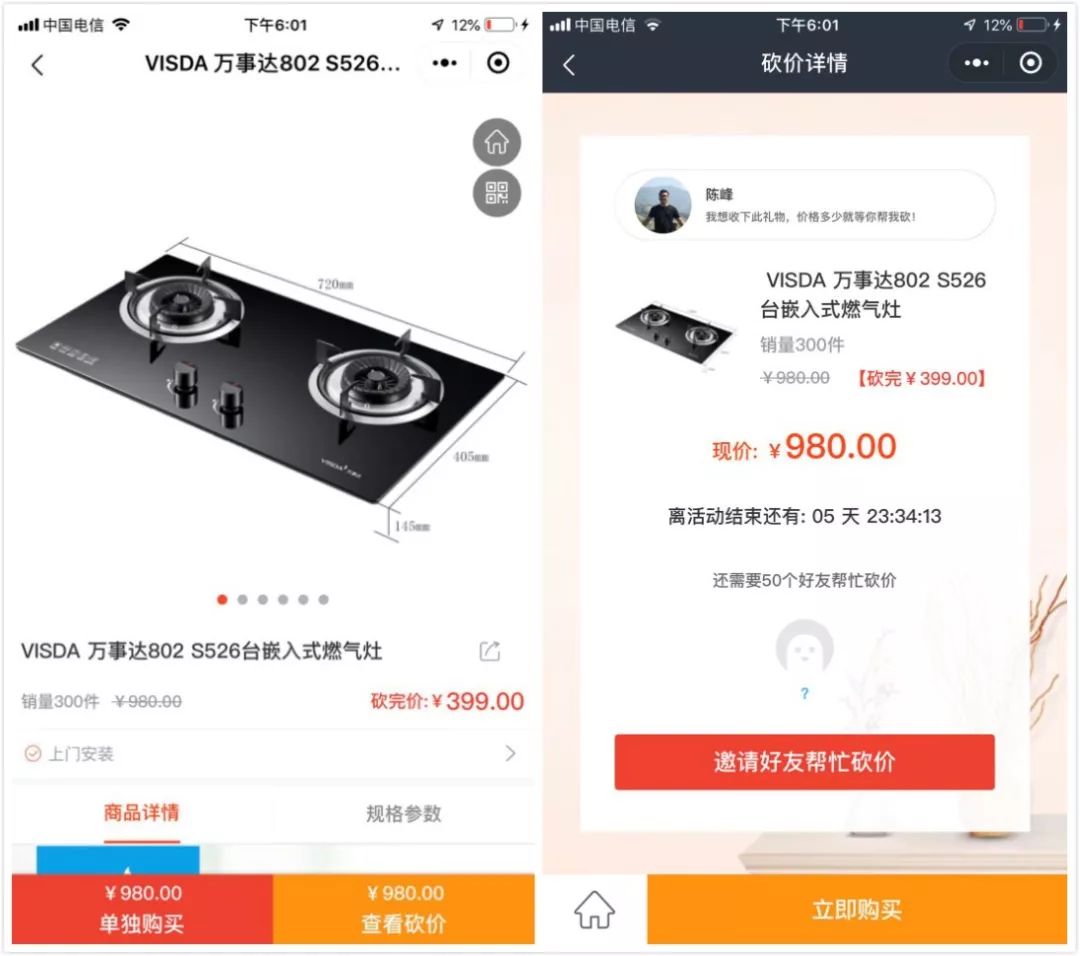 通過有競爭力的單品或者套餐組合,利用移動互聯(lián)網(wǎng)裂變的特性,讓用戶去推薦朋友幫助砍價,在實現(xiàn)產(chǎn)品線上引流和線下體驗成交的同時,實現(xiàn)品牌的曝光和產(chǎn)品促銷活動信息傳播推廣;