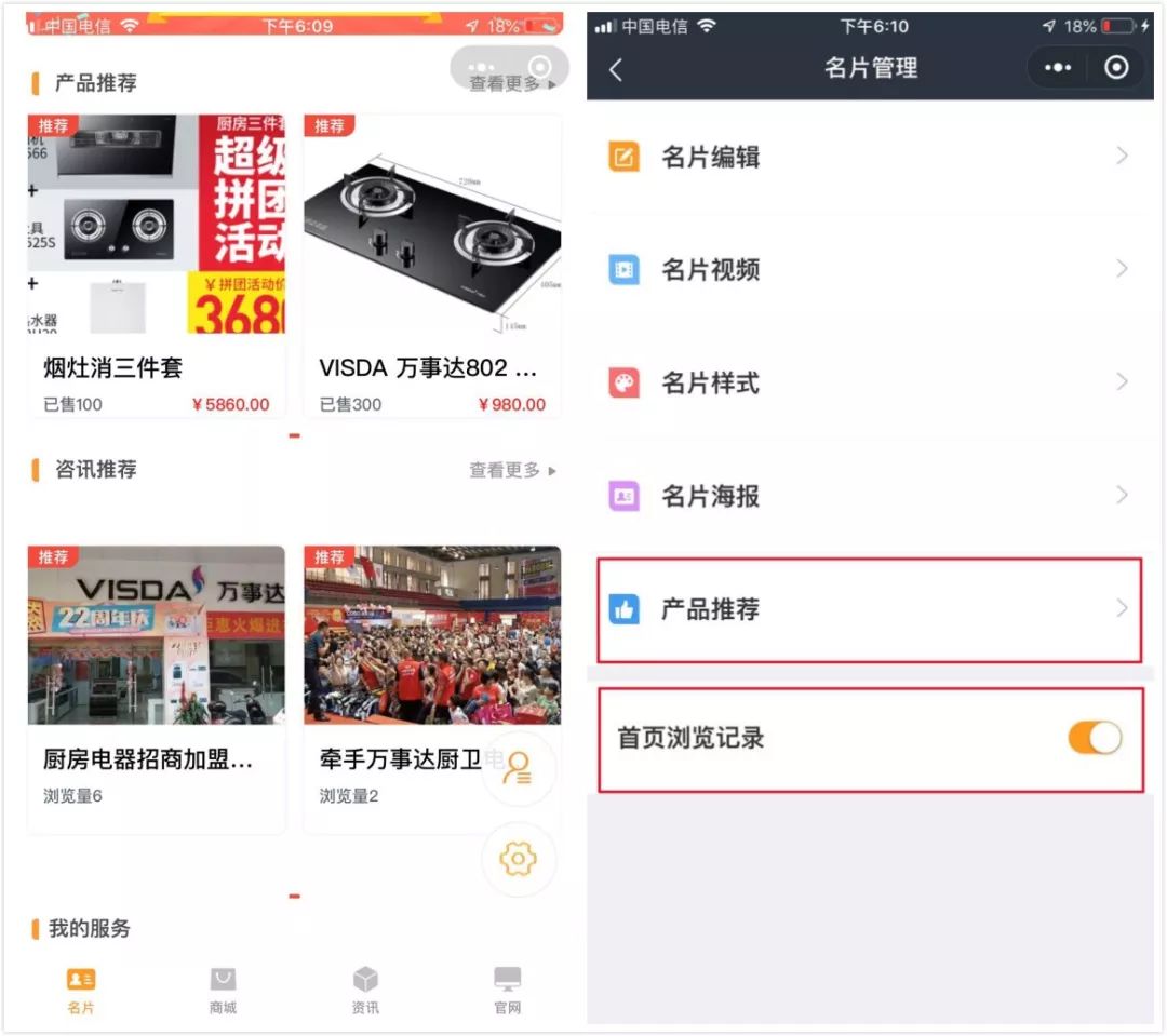 5、把推薦的產(chǎn)品、推薦的服務(wù)、推薦的資訊放到首頁;具體操作:管理中心—名片管理—產(chǎn)品推薦—選擇“商品推薦”“咨訊推薦”,填寫模塊名稱,選擇推薦數(shù)量2,返回上一層,刷新“首頁瀏覽記錄”