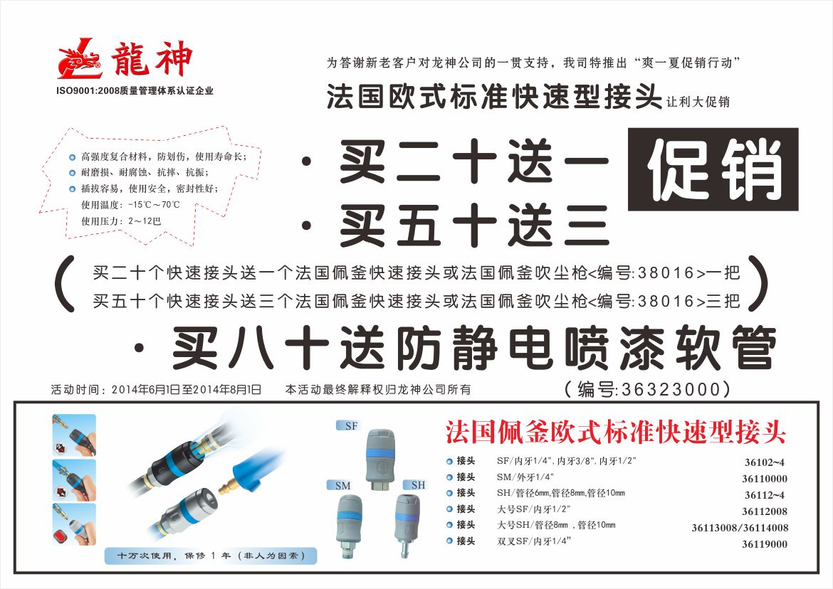 2、買五十送三(即買五十個(gè)快速接頭送三個(gè)法國(guó)佩釜快速接頭或法法國(guó)佩釜吹塵槍(編號(hào):38016)三把)