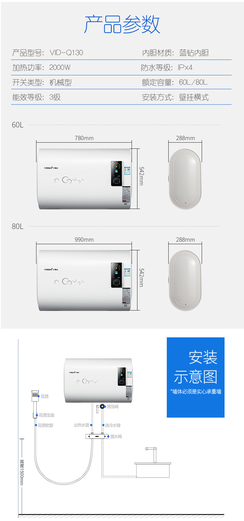 2、進出水內(nèi)置雙防電墻,確保安全;