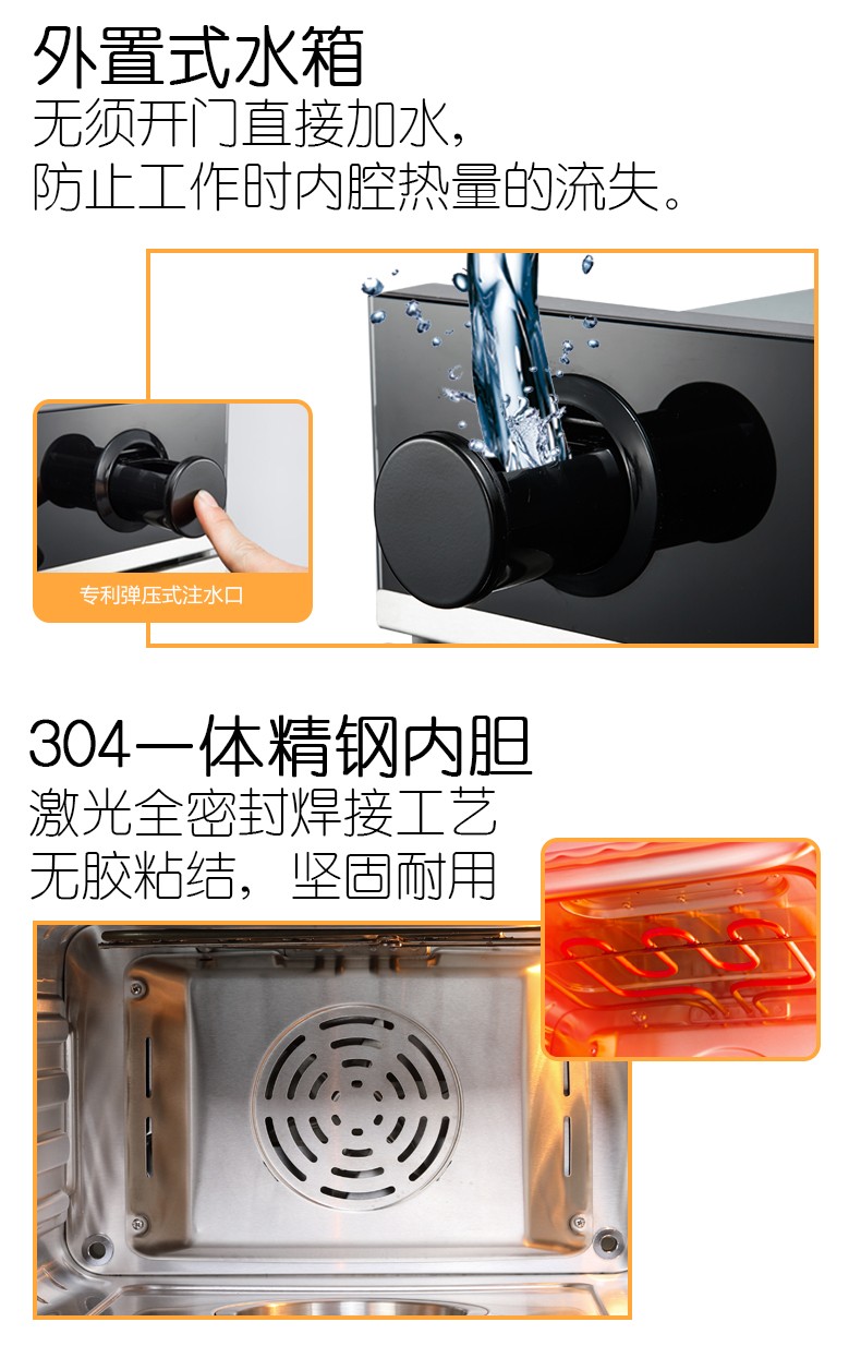 5、外置彈壓式注水口專利技術(shù),在烹飪食物工作過程中如果缺水可以不用關(guān)掉機器和打開門直接進行加水,減少不必要操作同時避免熱量流失;