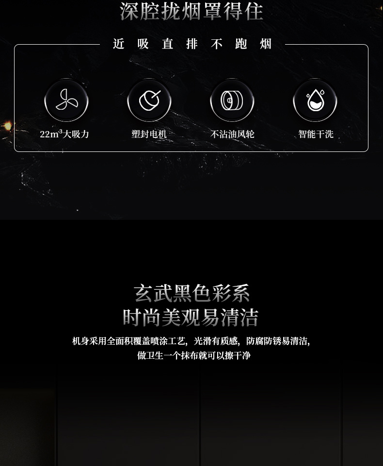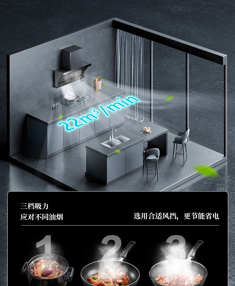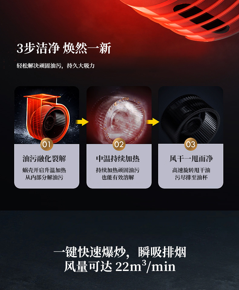 ◆一鍵快速爆炒,迅吸排煙,風(fēng)量可達(dá)22m3/min;