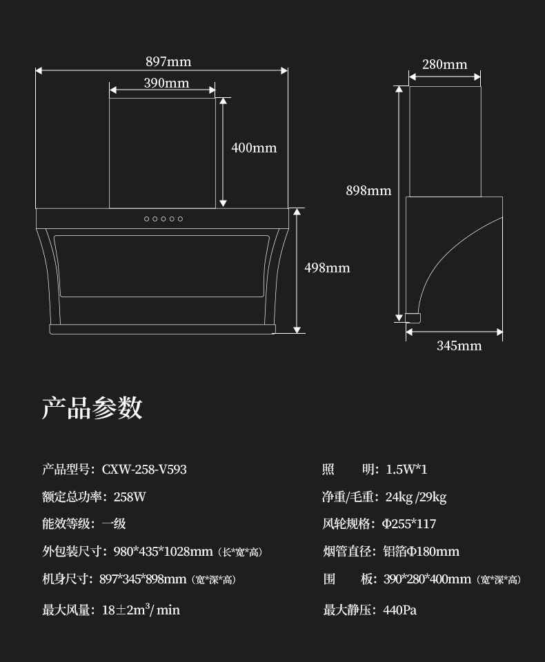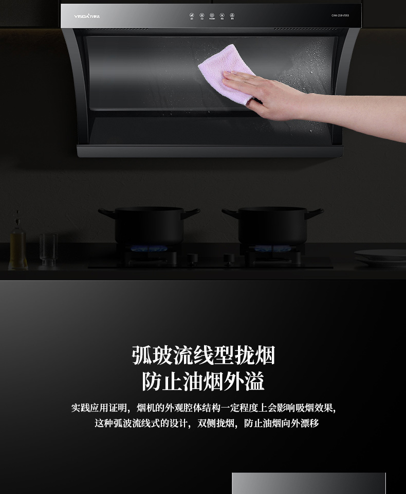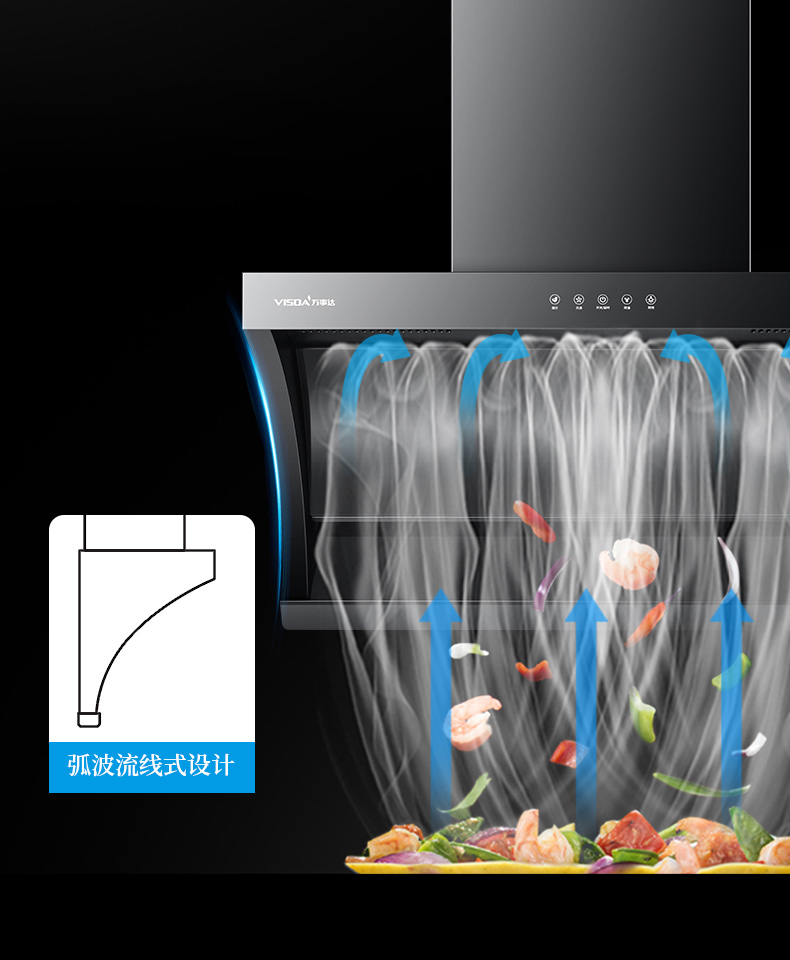◆弧玻流線型攏煙,有效防止油煙外溢;