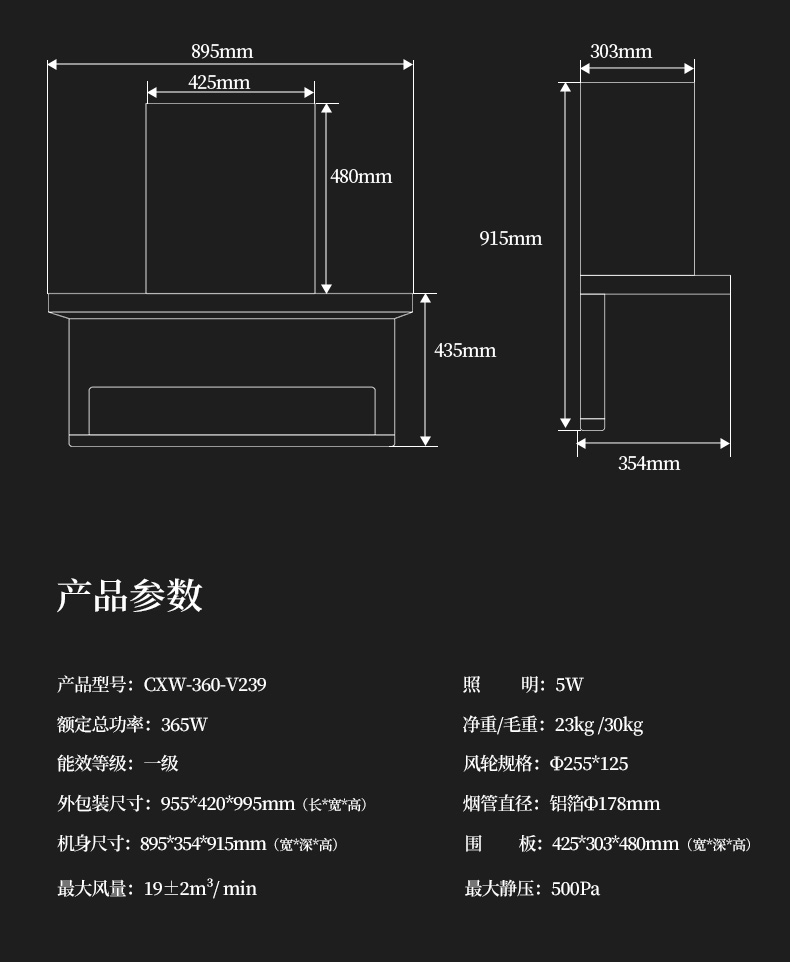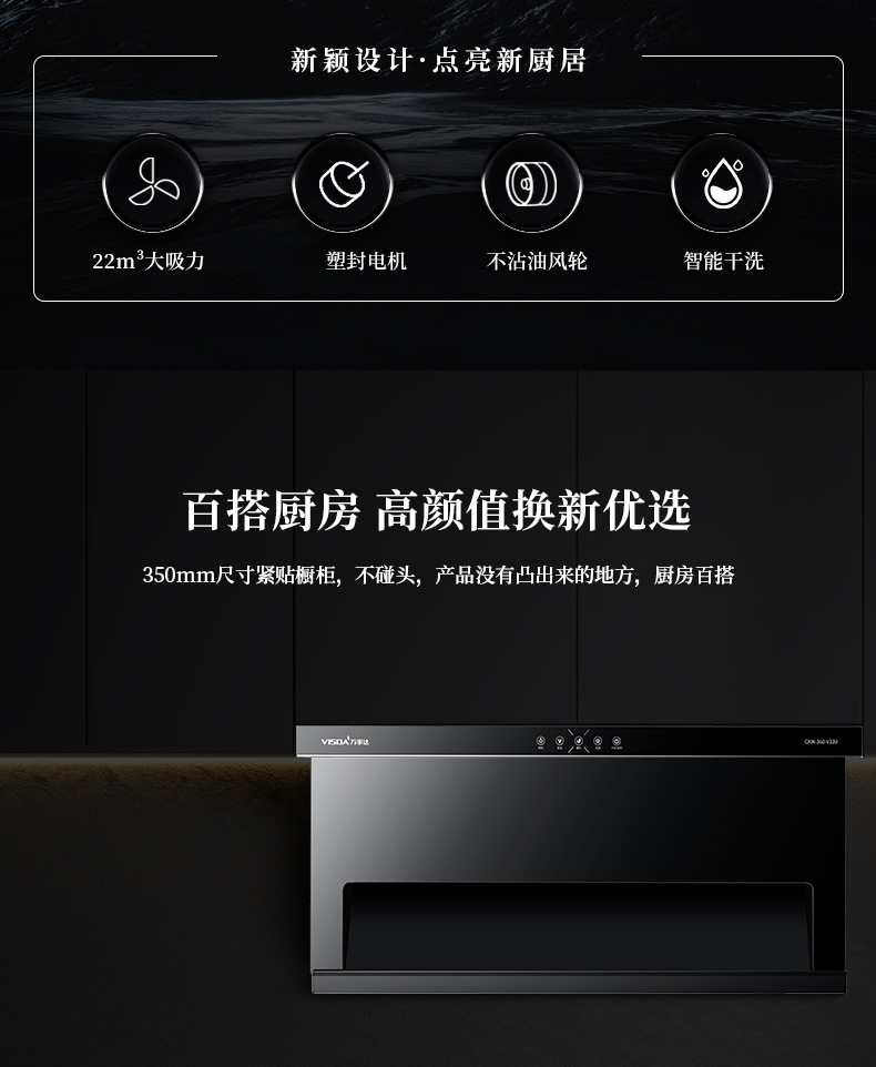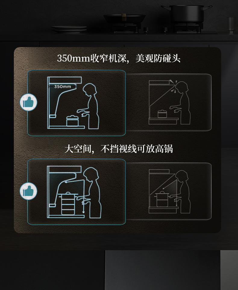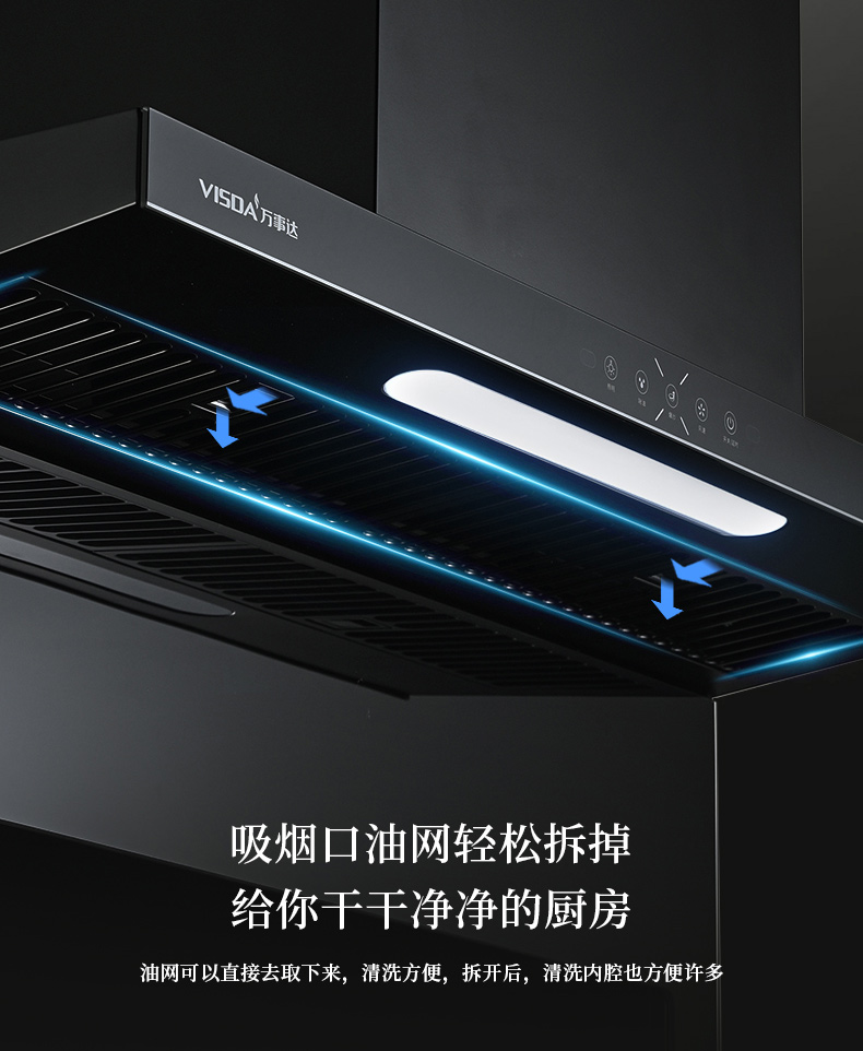 ◆頂側(cè)雙吸,有效防止油煙外溢,吸煙效果更佳;