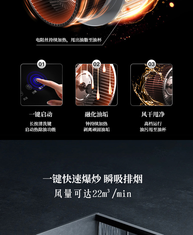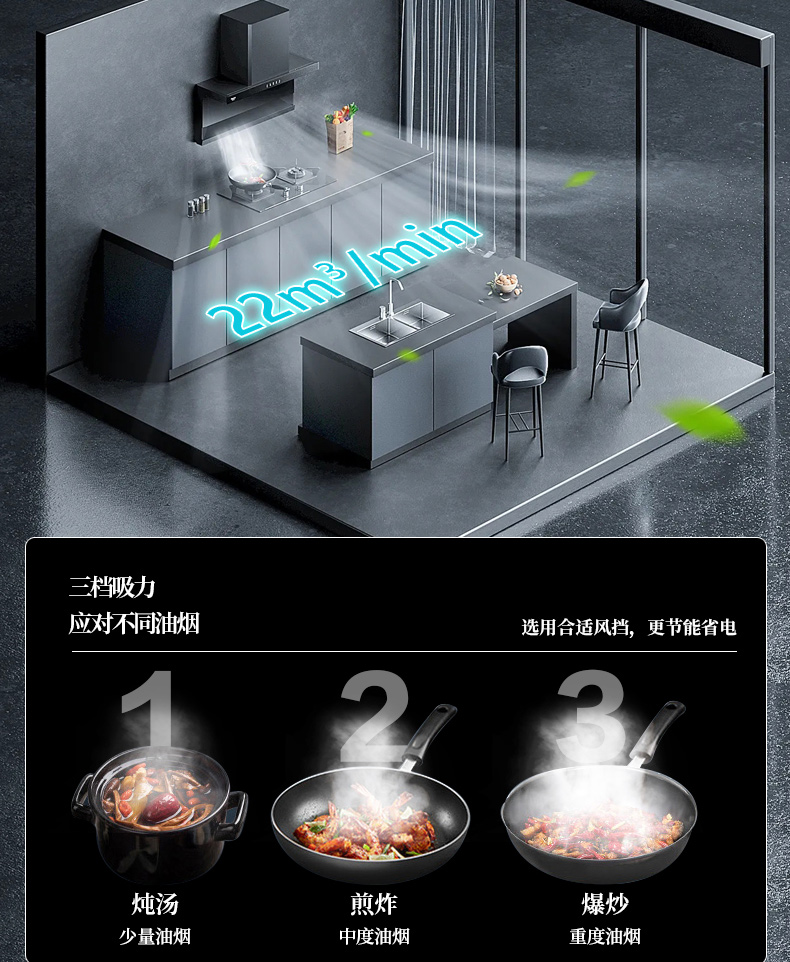 ◆一鍵快速爆炒,迅吸排煙,風(fēng)量可達(dá)22m3/min