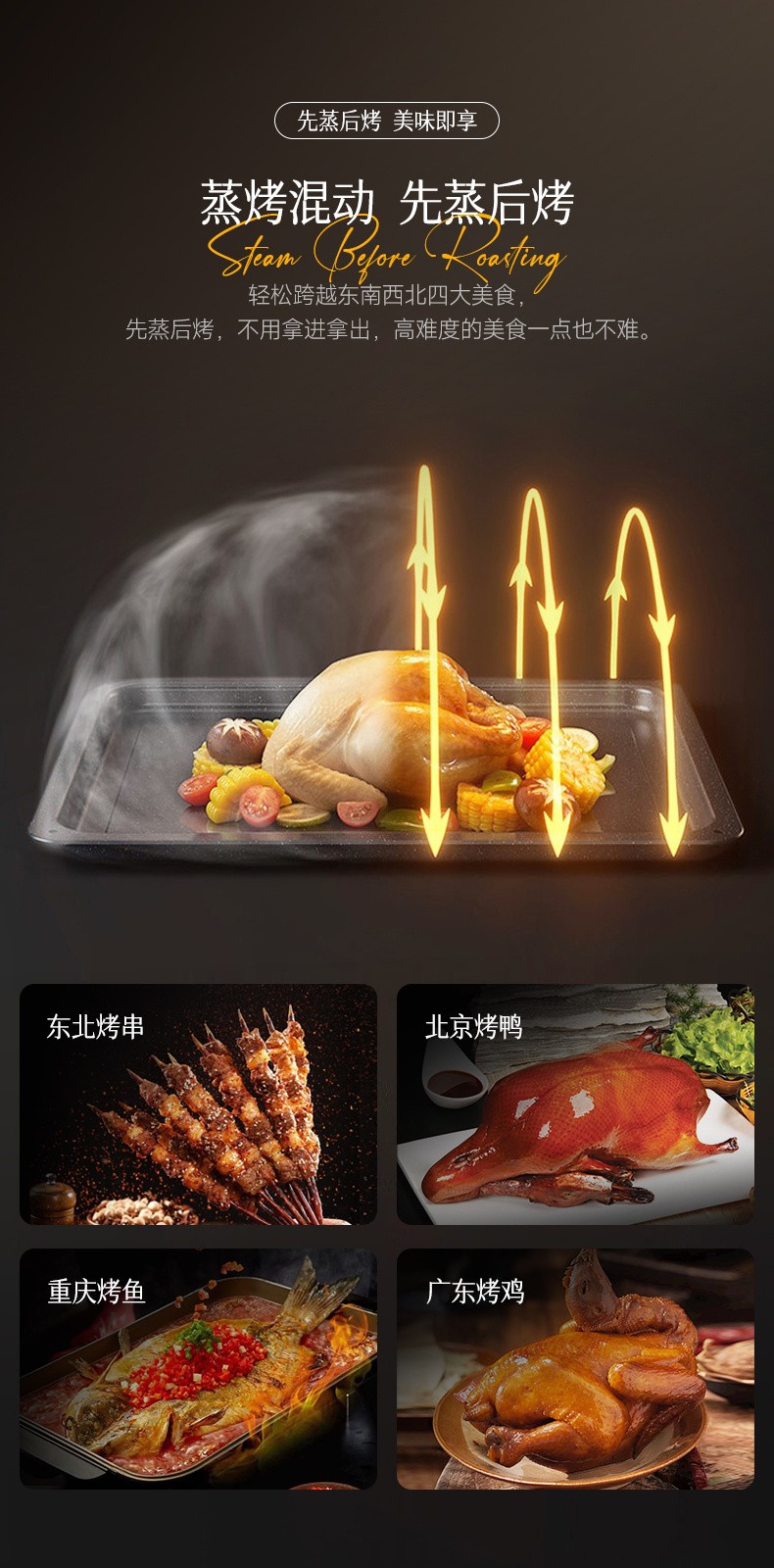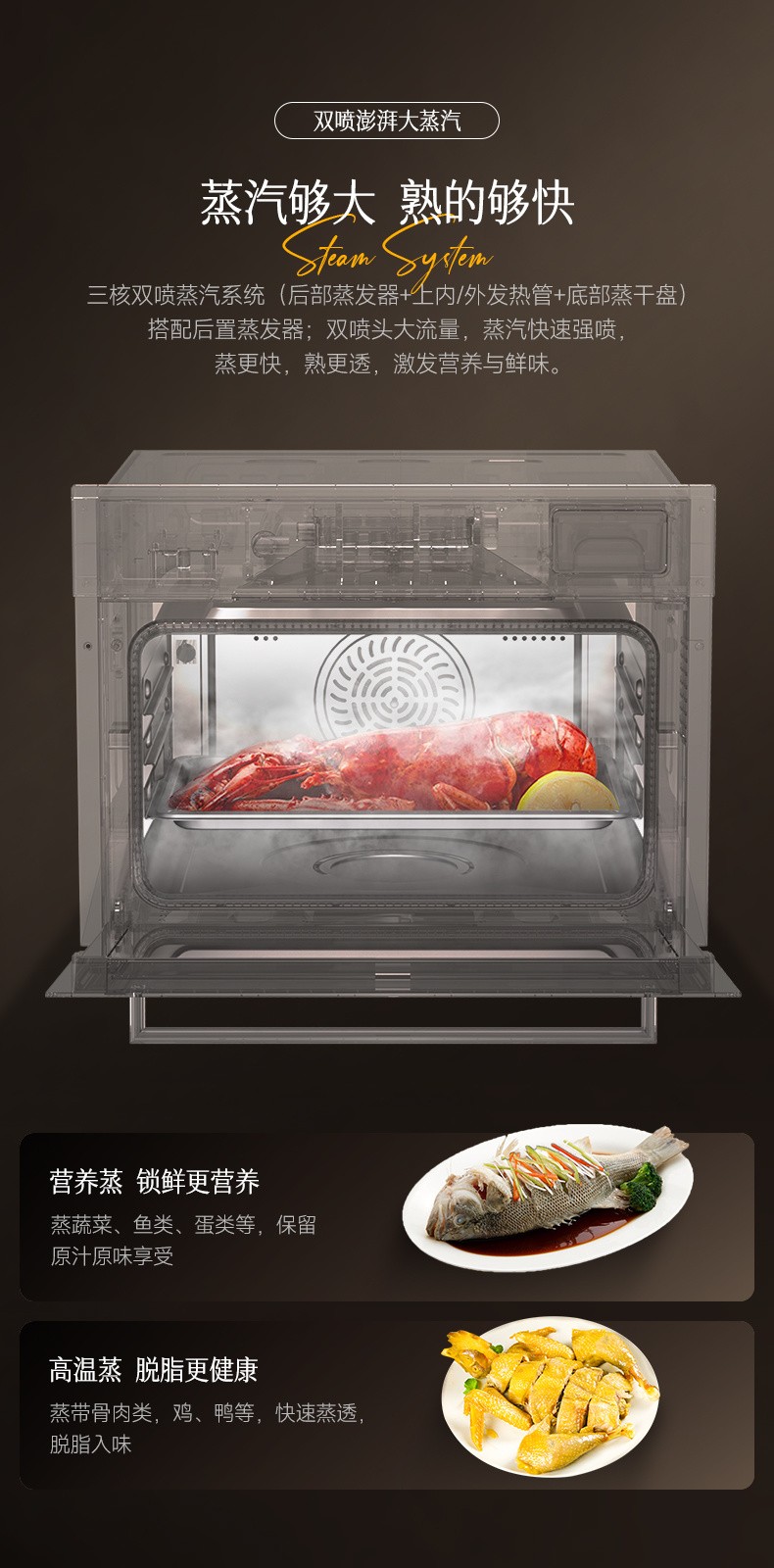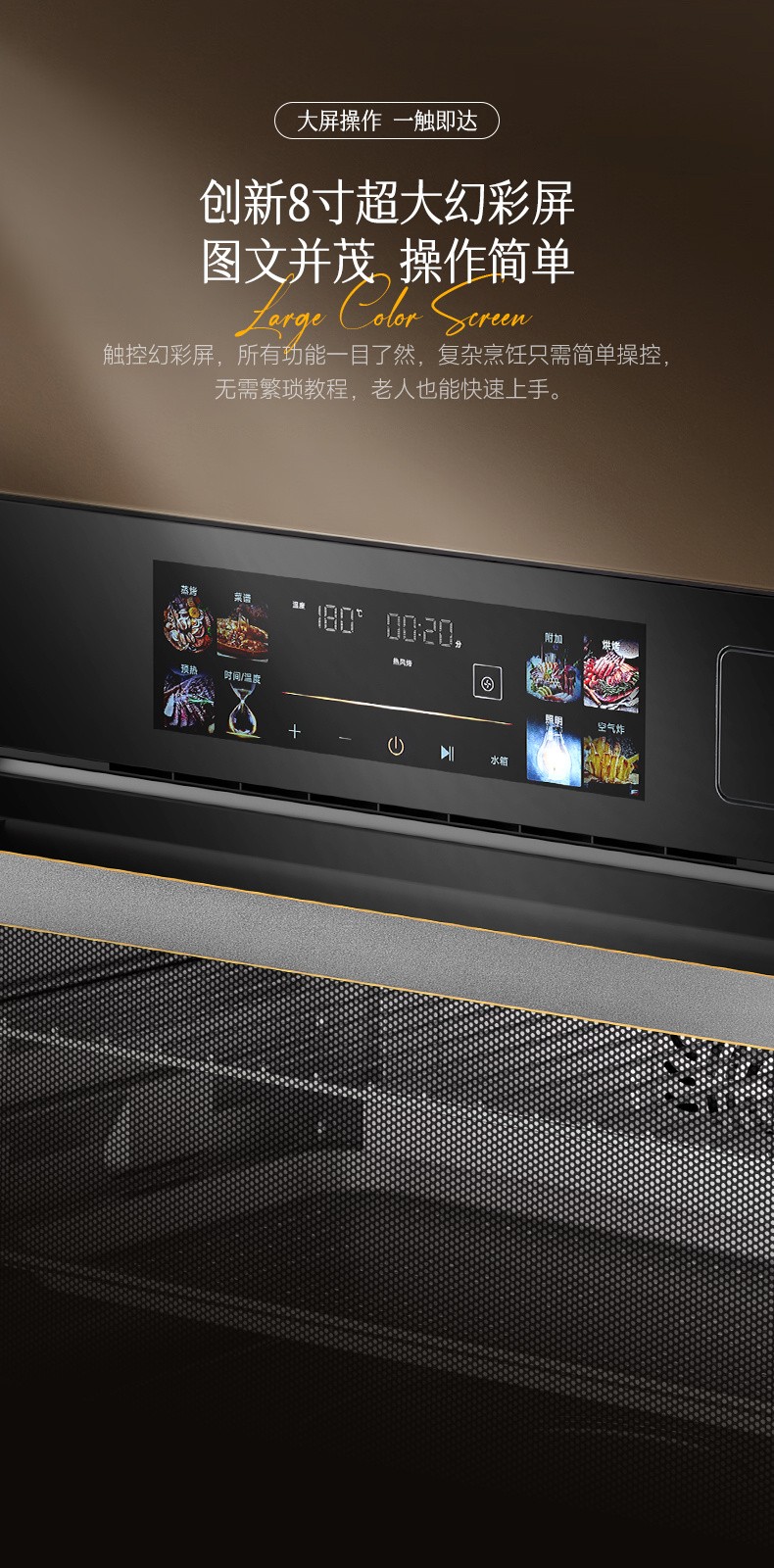2、48L大容量,蒸與烤跨界組合,一機兩用; 3、后置蒸發(fā)器,雙噴頭大流量,蒸汽快速; 4、8寸觸摸彩屏開關,交互式顯示,圖文并茂,簡潔易懂; 5、內(nèi)膽一體拉伸成形,采用激光焊接,密封及耐用性好; 6、上置式電動打開水箱設計,空間利用率高,烹飪過程無需打開門加水; 7、多種蒸烤加熱模式,溫控范圍廣,溫度掌控更輕松; 8、三核蒸汽烹飪(后部蒸發(fā)器+上內(nèi)/外發(fā)熱管+底部蒸干盤),快速升溫,效率更高。" />