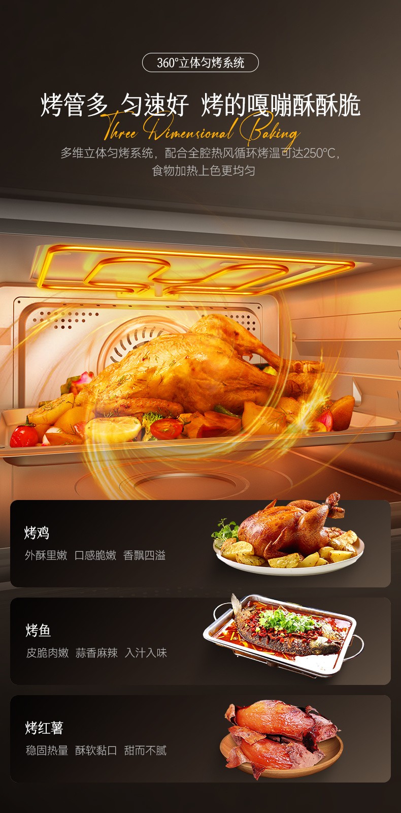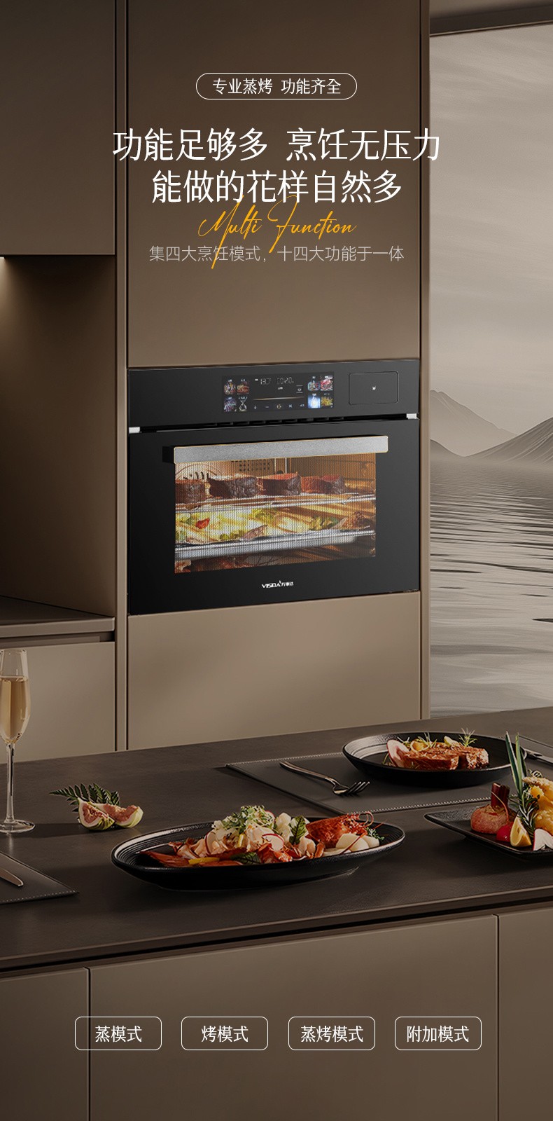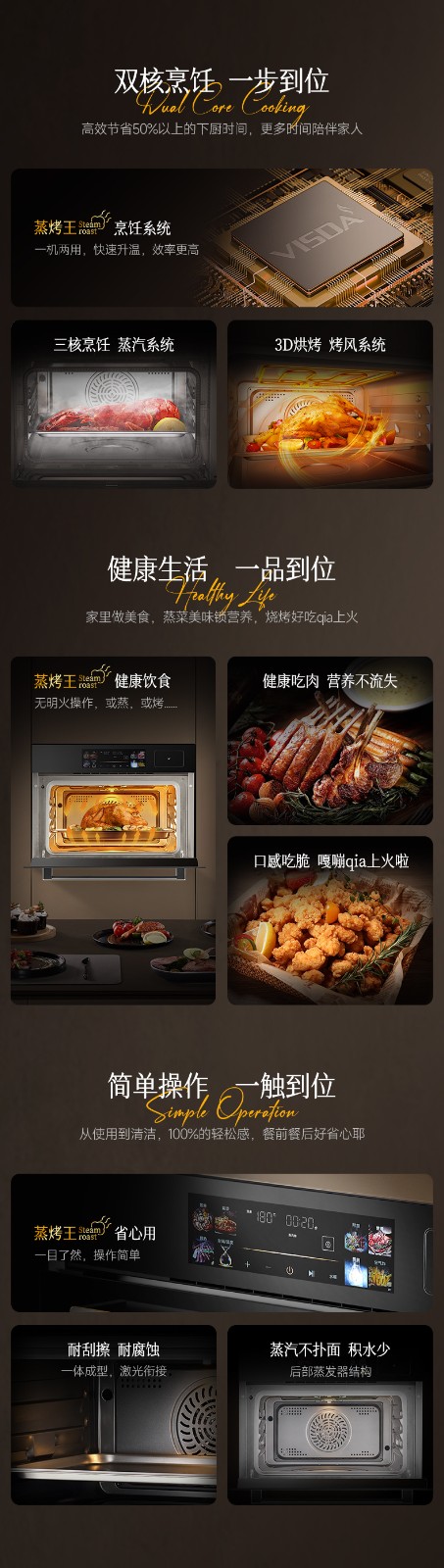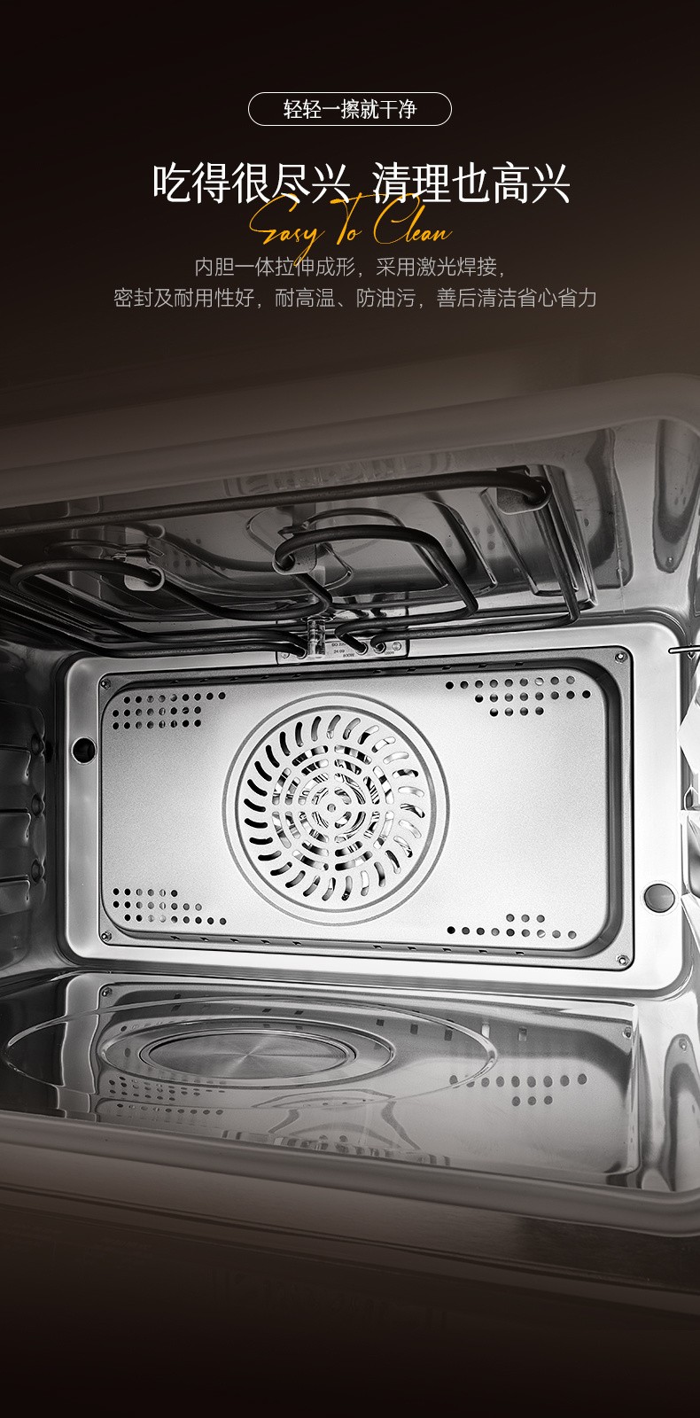 2、48L大容量,蒸與烤跨界組合,一機兩用; 3、后置蒸發(fā)器,雙噴頭大流量,蒸汽快速; 4、8寸觸摸彩屏開關,交互式顯示,圖文并茂,簡潔易懂; 5、內(nèi)膽一體拉伸成形,采用激光焊接,密封及耐用性好; 6、上置式電動打開水箱設計,空間利用率高,烹飪過程無需打開門加水; 7、多種蒸烤加熱模式,溫控范圍廣,溫度掌控更輕松; 8、三核蒸汽烹飪(后部蒸發(fā)器+上內(nèi)/外發(fā)熱管+底部蒸干盤),快速升溫,效率更高。" />